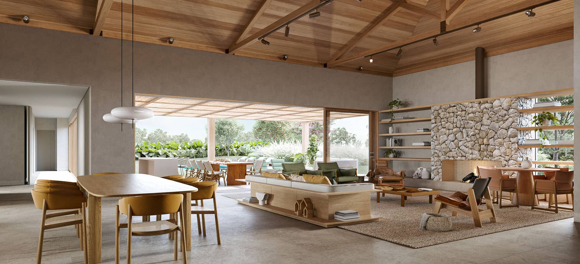 Forro e tesouras estruturais em madeira maciça em toda área do living e jantar, assim como os pergolados e aletas. Fachadas em pedra moledo ou similar e textura especial. Caixilhos e venezianas em alumínio com pintura marrom corten e/ou madeirado.